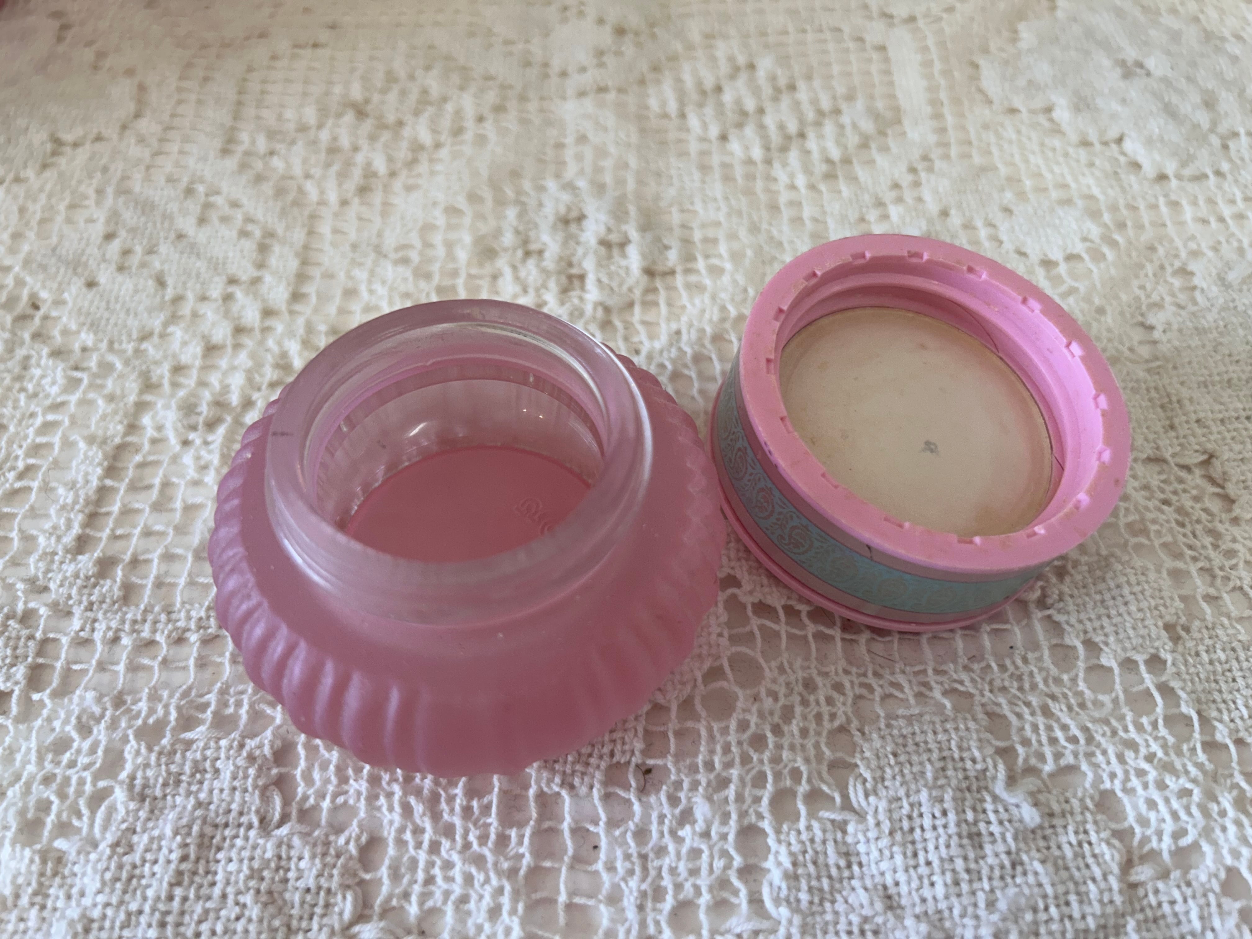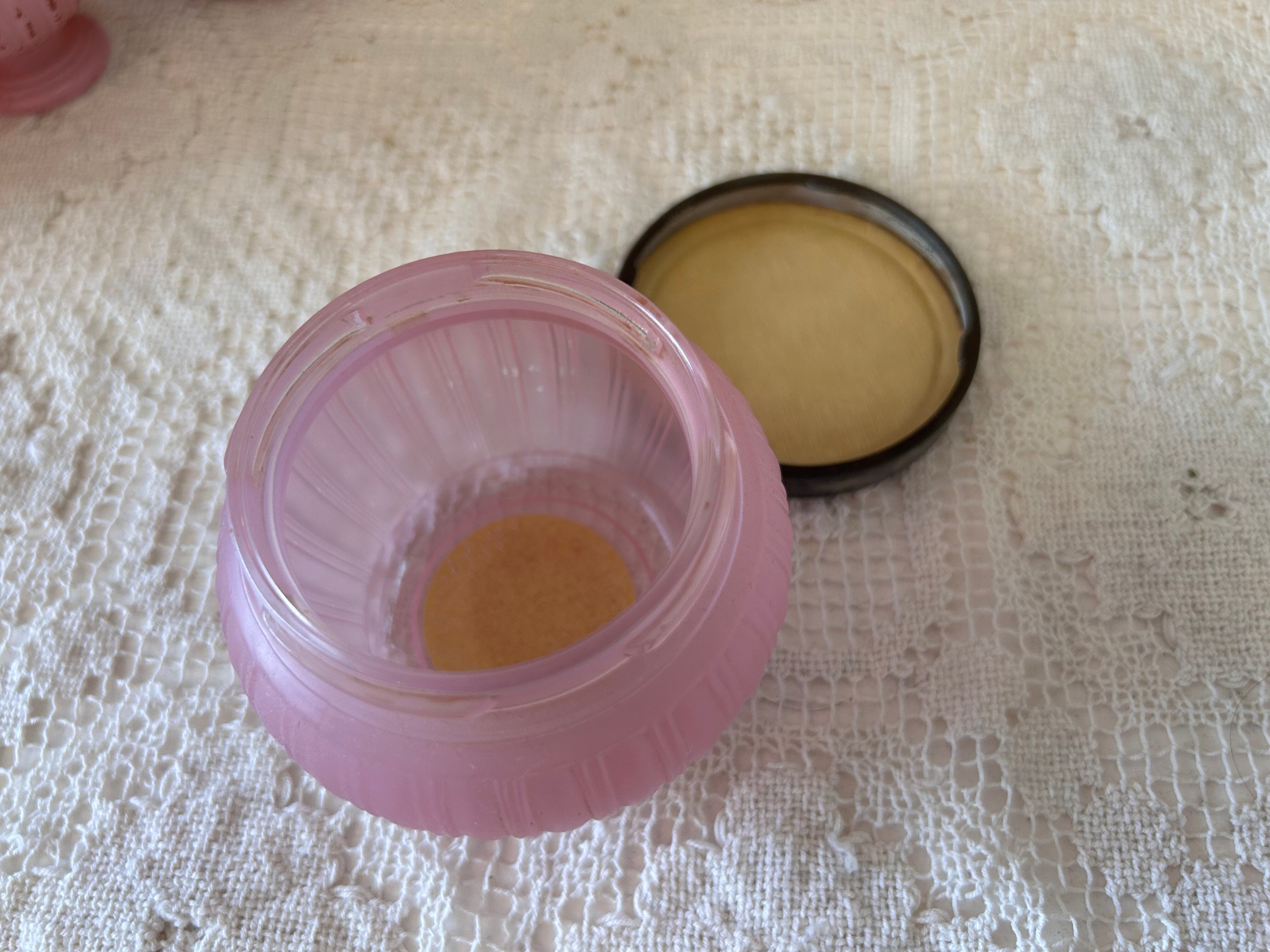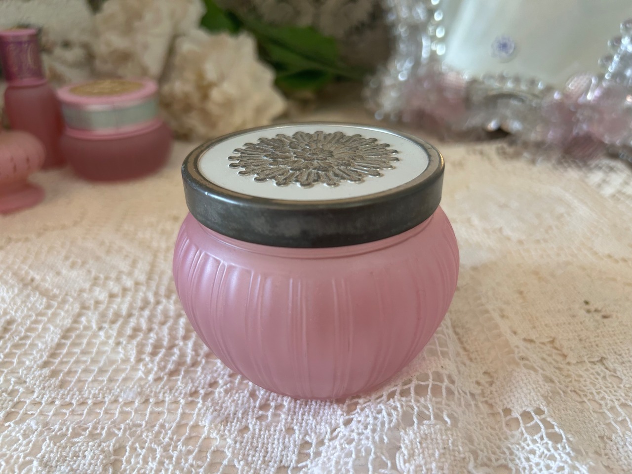 ガラスクリームボトル2点、小さな香水瓶1点のセットです。ボトル大は、ボトルにはハゲなく綺麗ですが、蓋に劣化がみられます。また、蓋のデザインが少し違います。