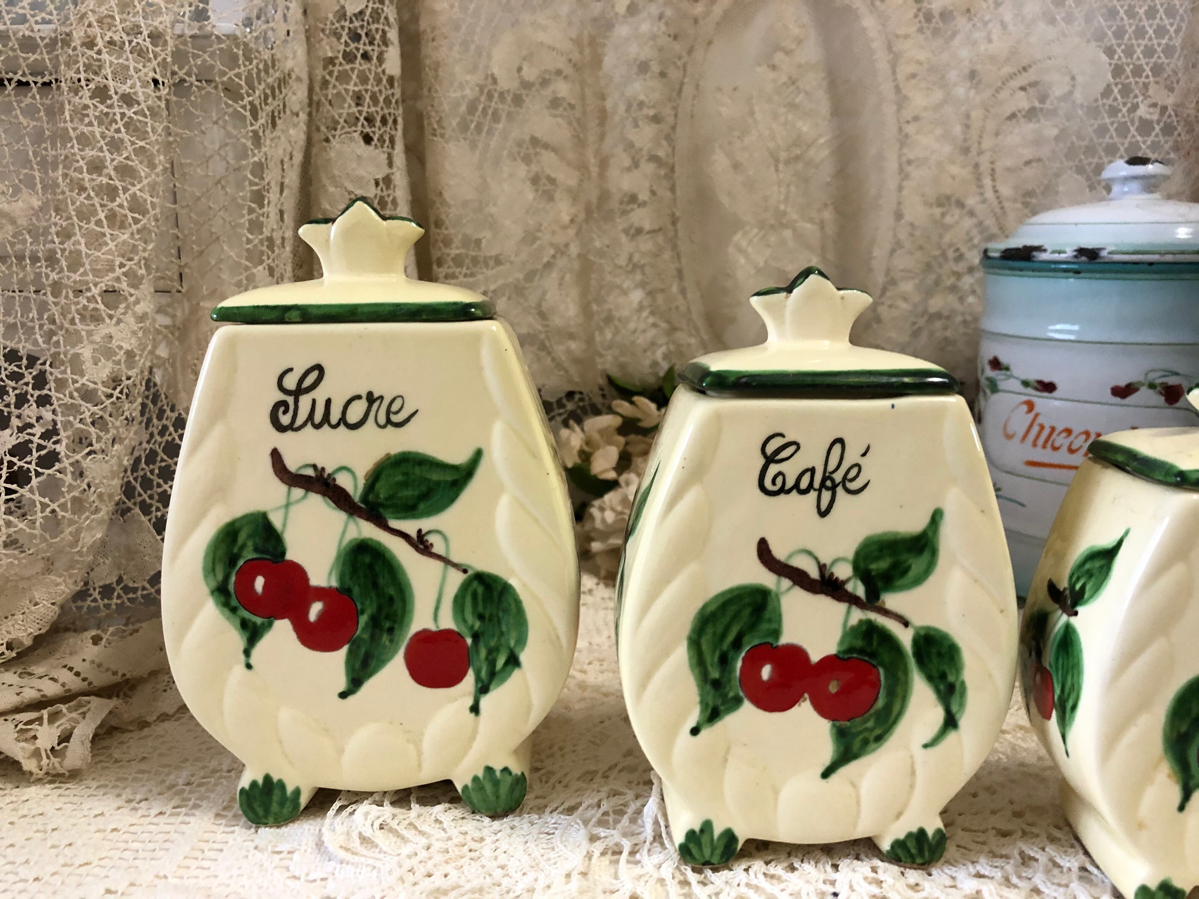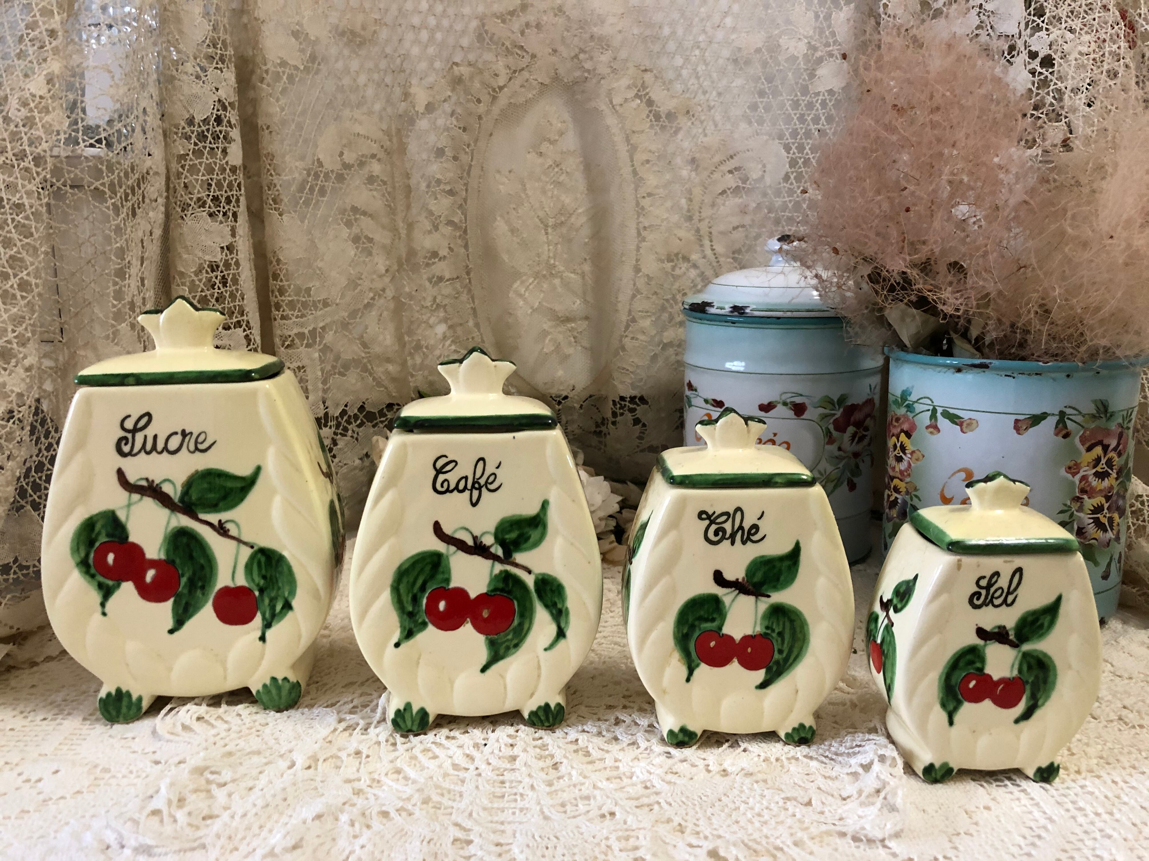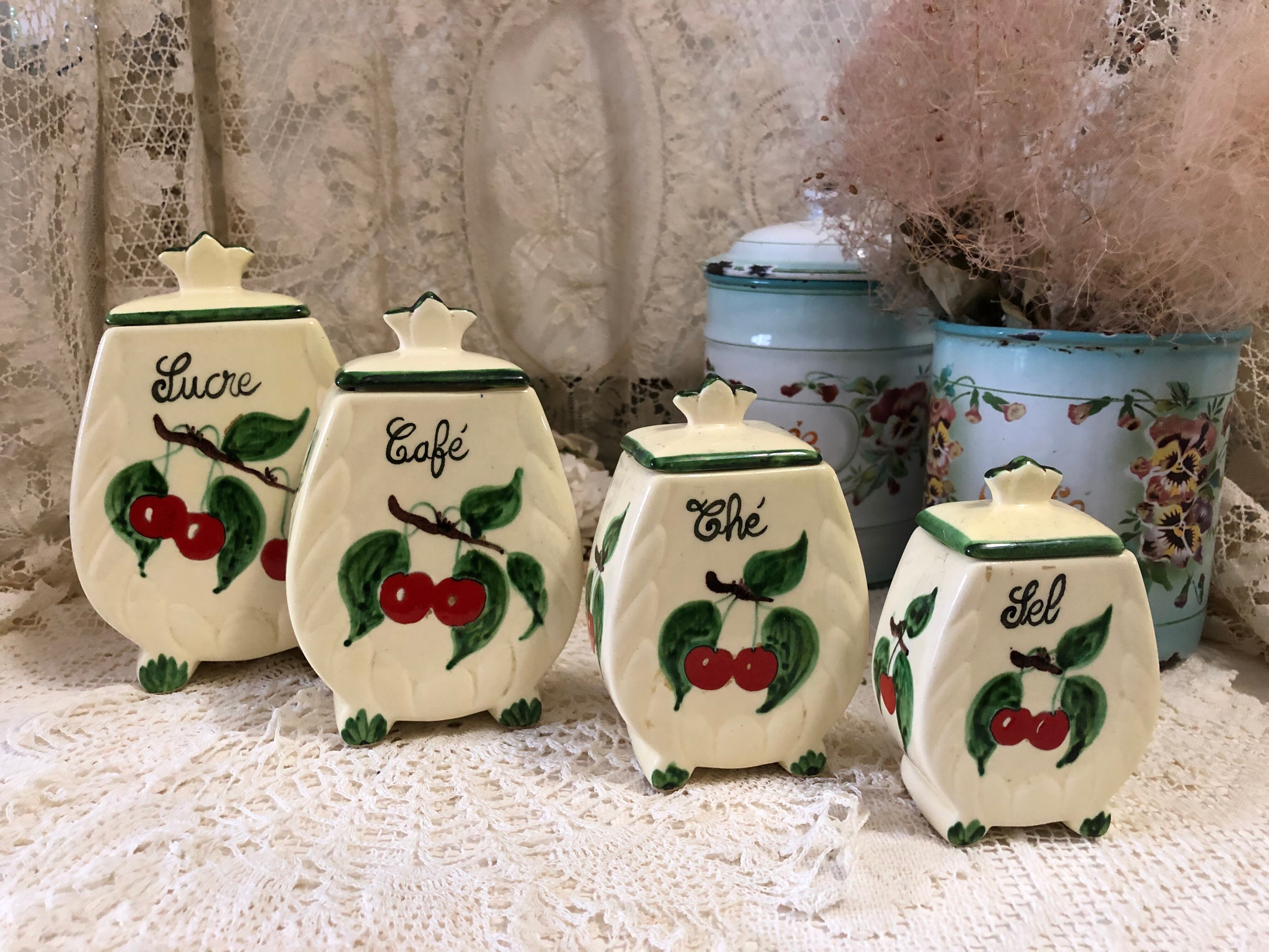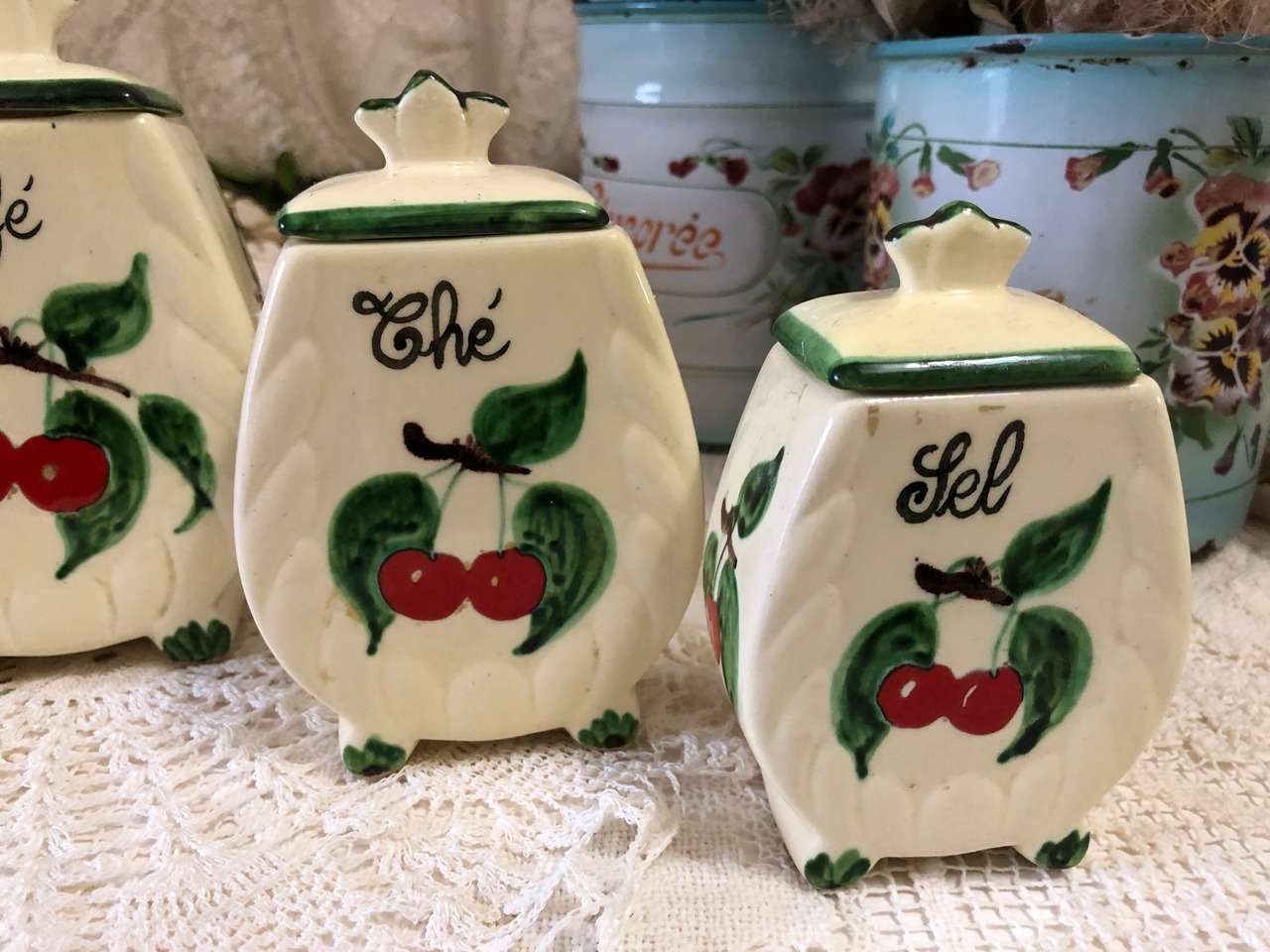 フランス・プロバンス地方ヴァロリスの陶器製のヴィンテージ キャニスター4セットです。黄色にグリーンの縁取り、さくらんぼ柄が可愛いです。