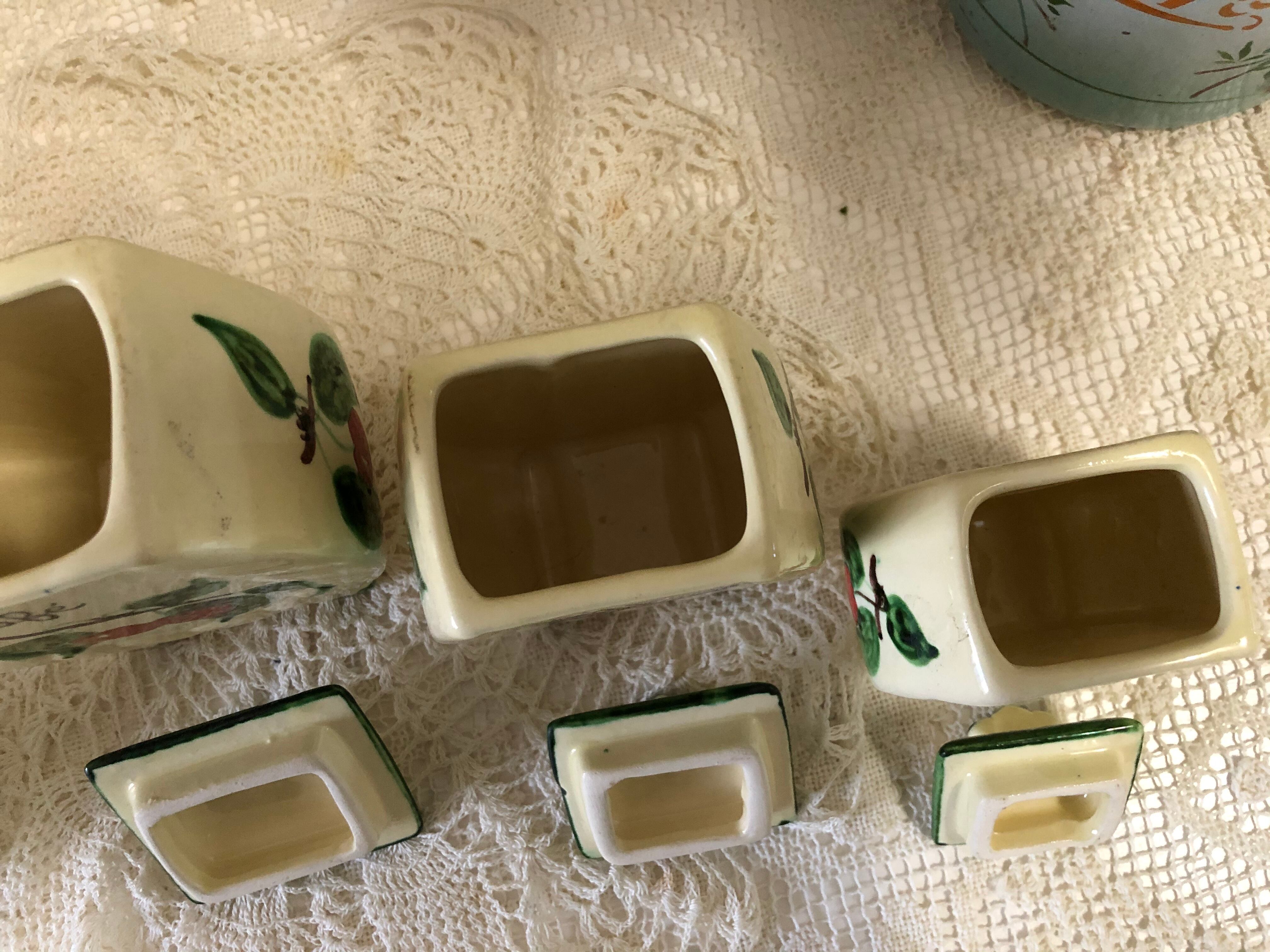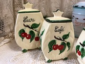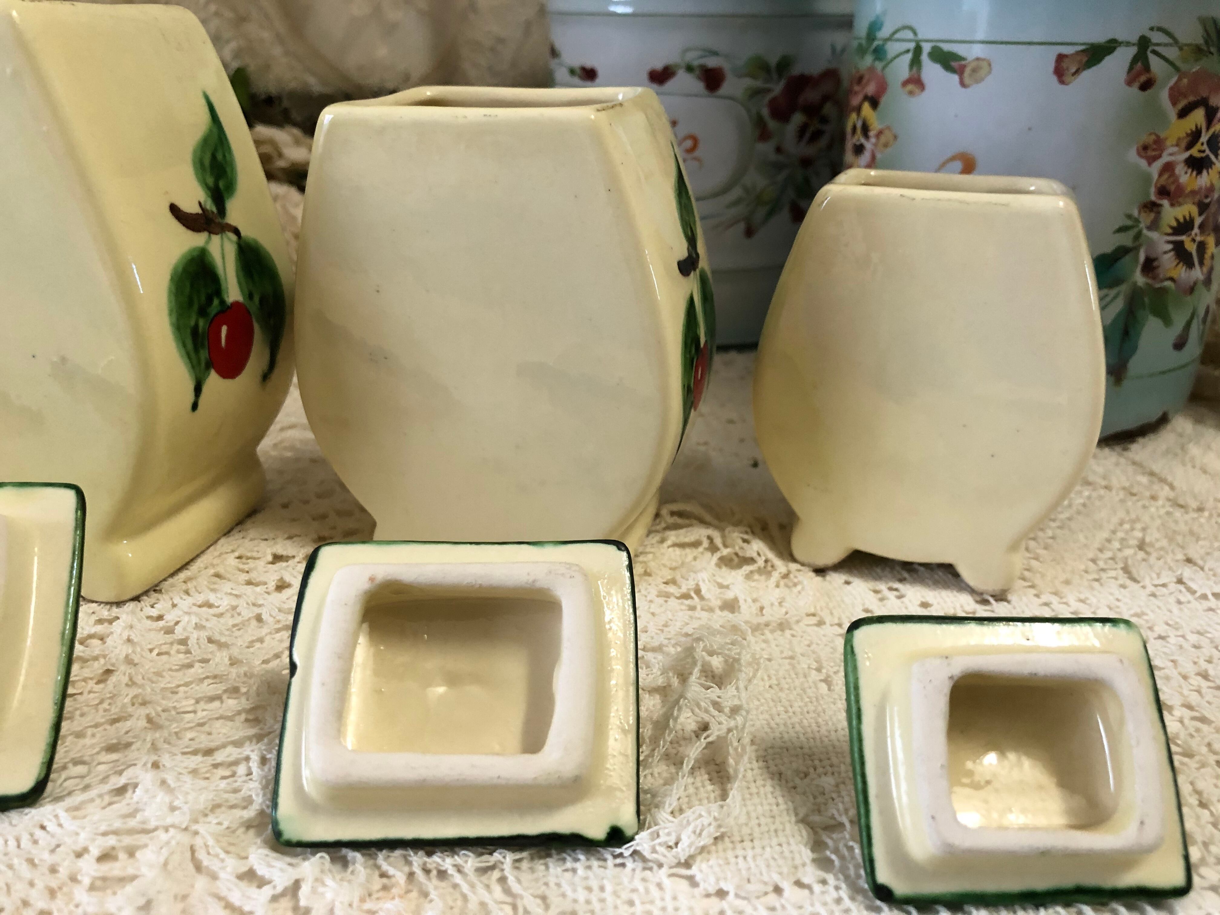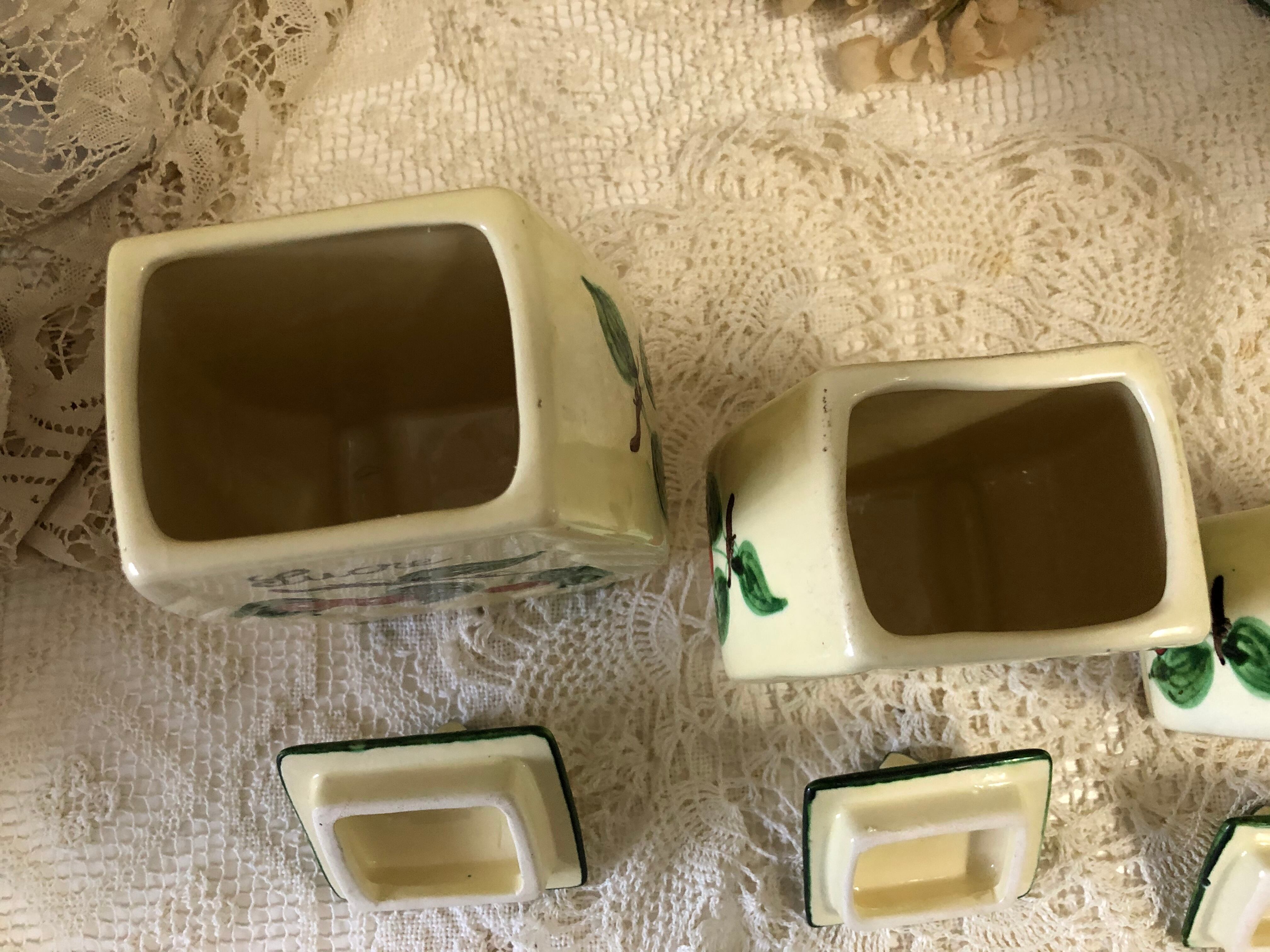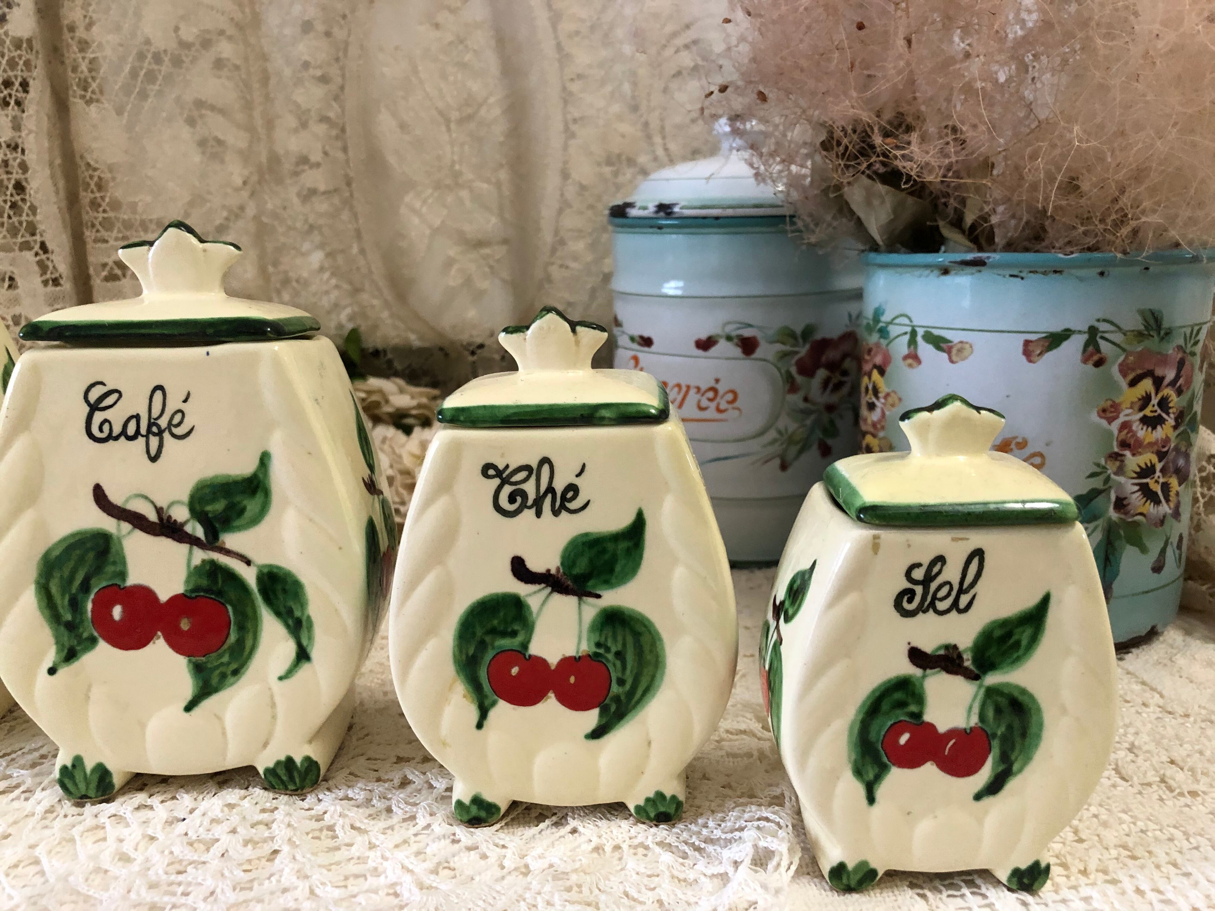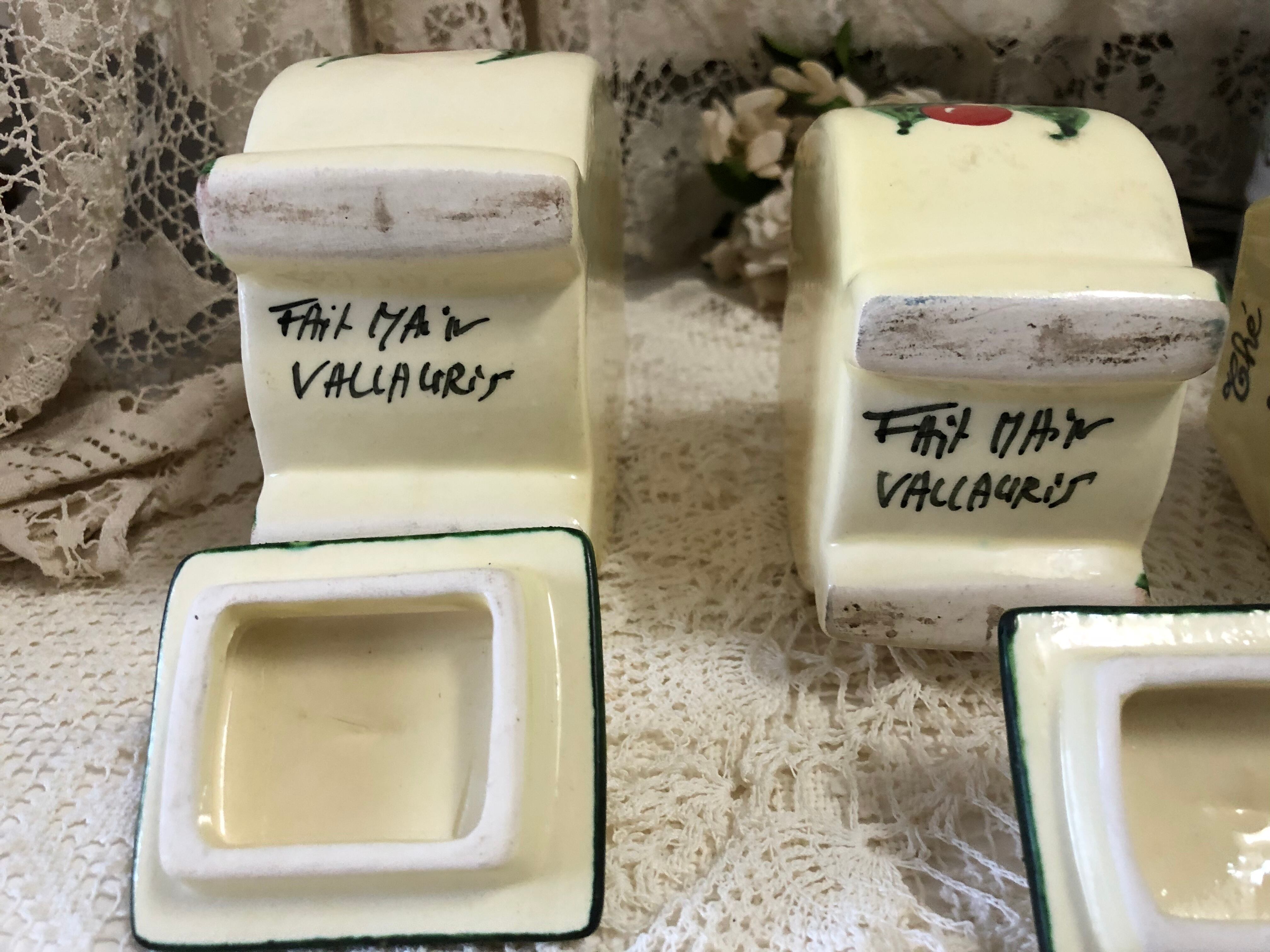 フランス・プロバンス地方ヴァロリスの陶器製のヴィンテージ キャニスター4セットです。黄色にグリーンの縁取り、さくらんぼ柄が可愛いです。
