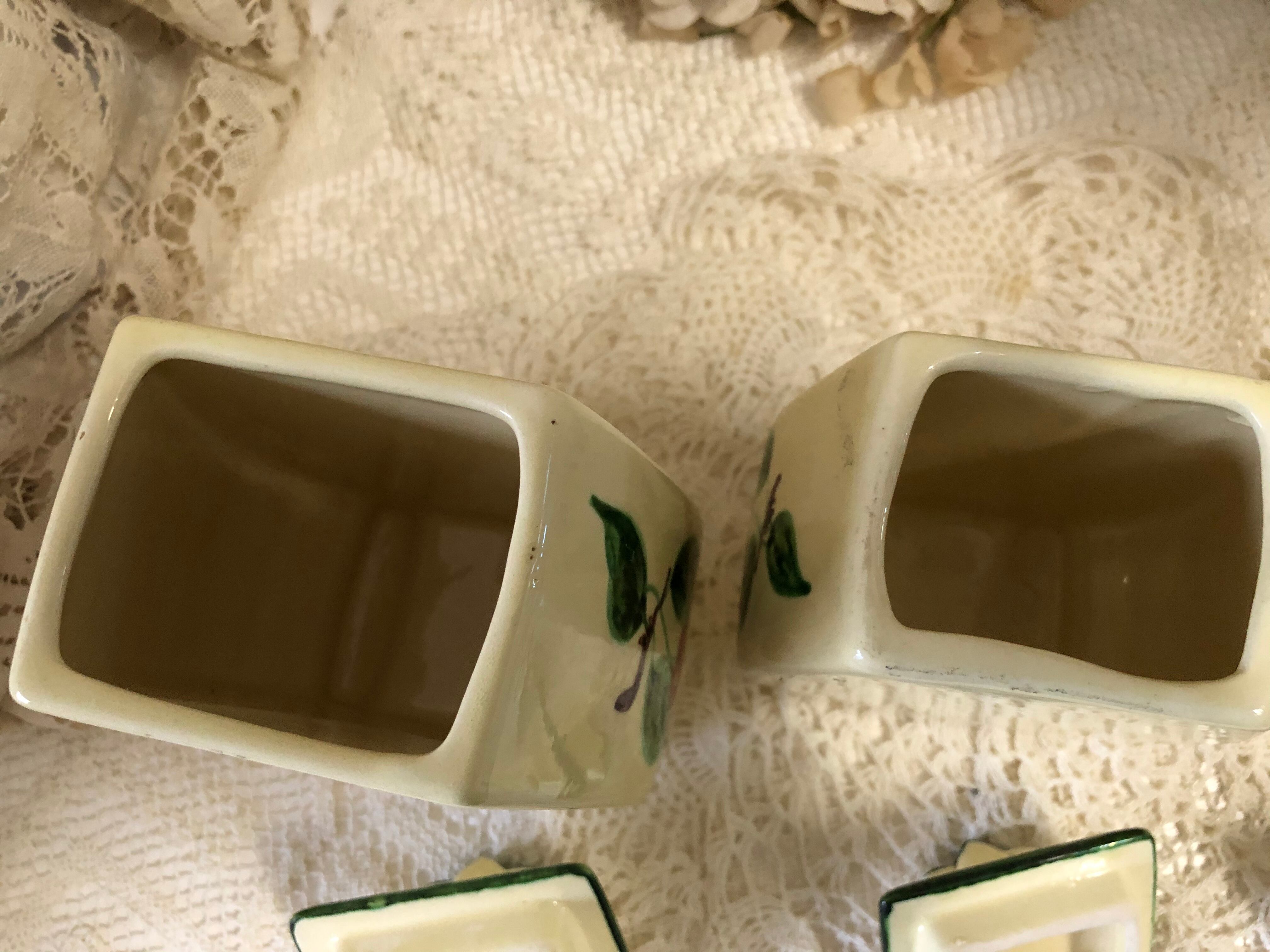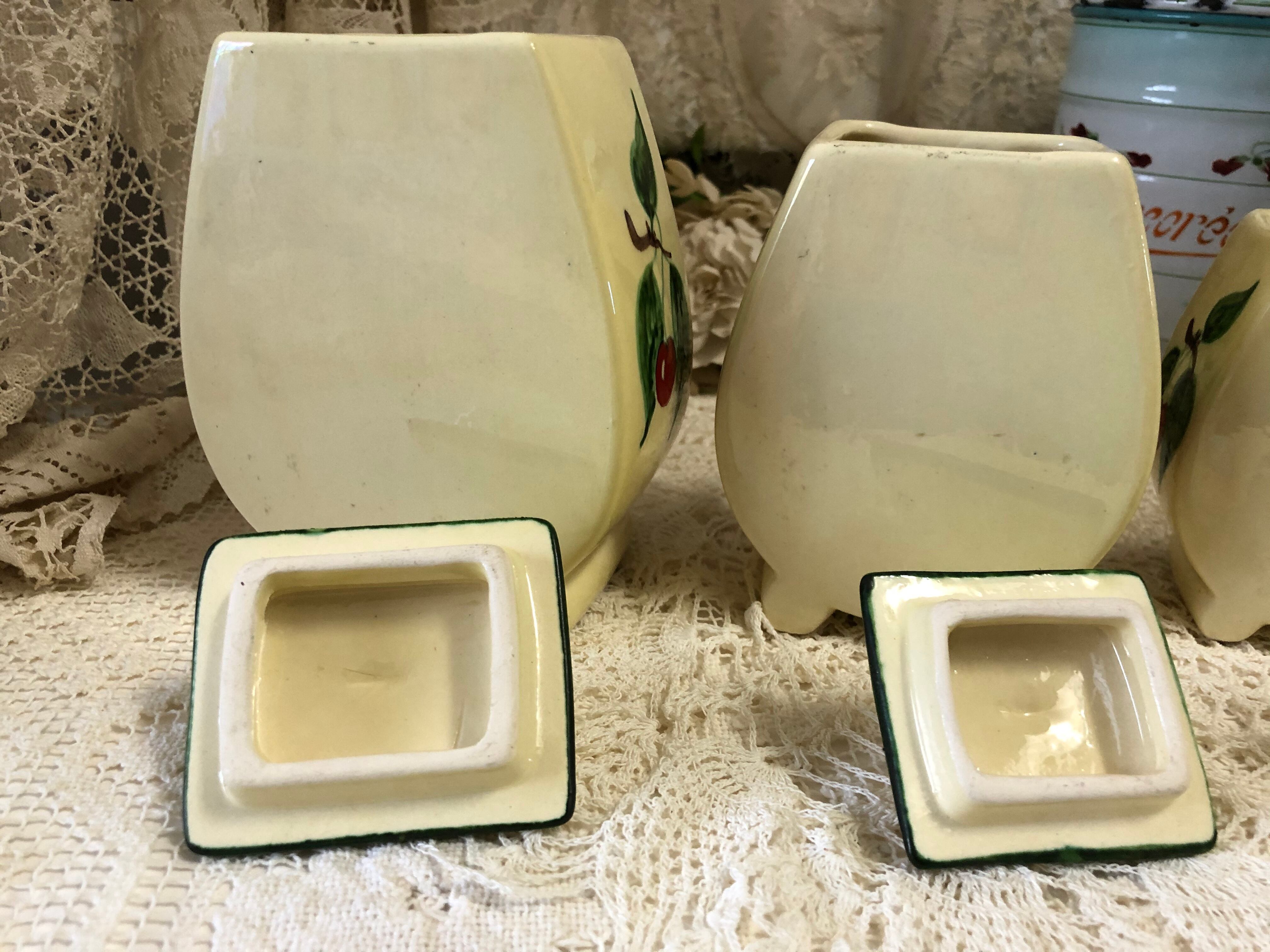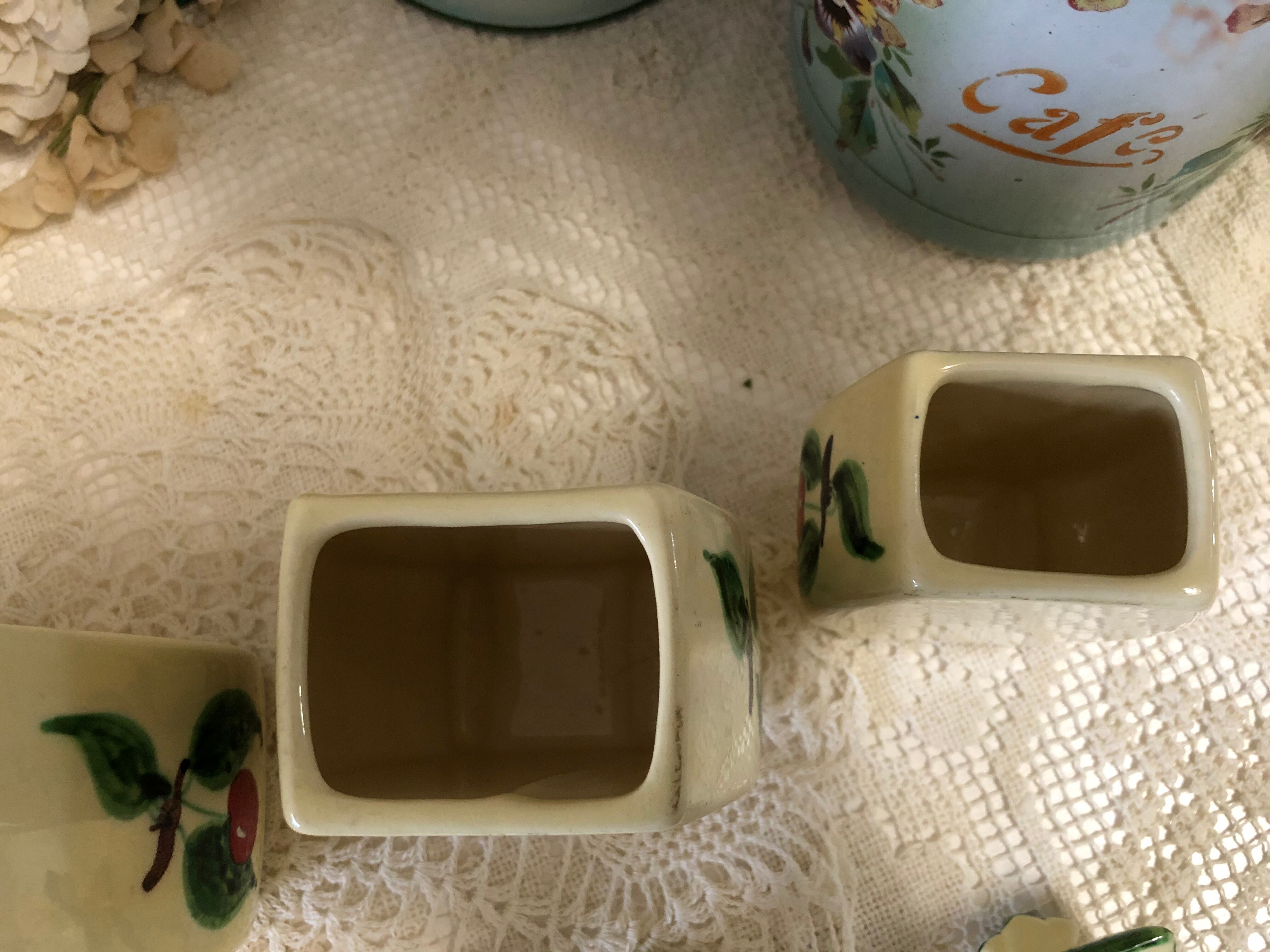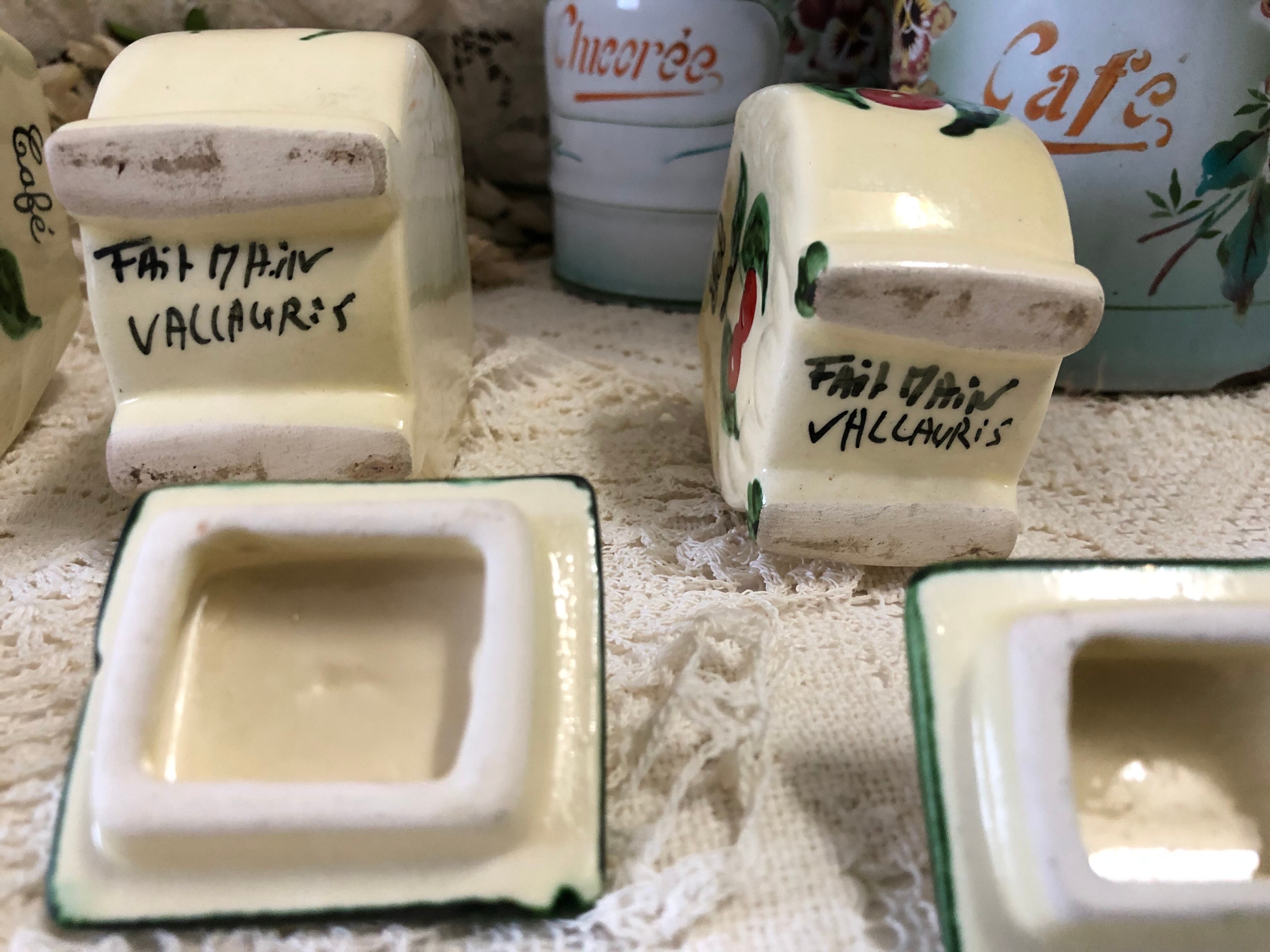 フランス・プロバンス地方ヴァロリスの陶器製のヴィンテージ キャニスター4セットです。黄色にグリーンの縁取り、さくらんぼ柄が可愛いです。