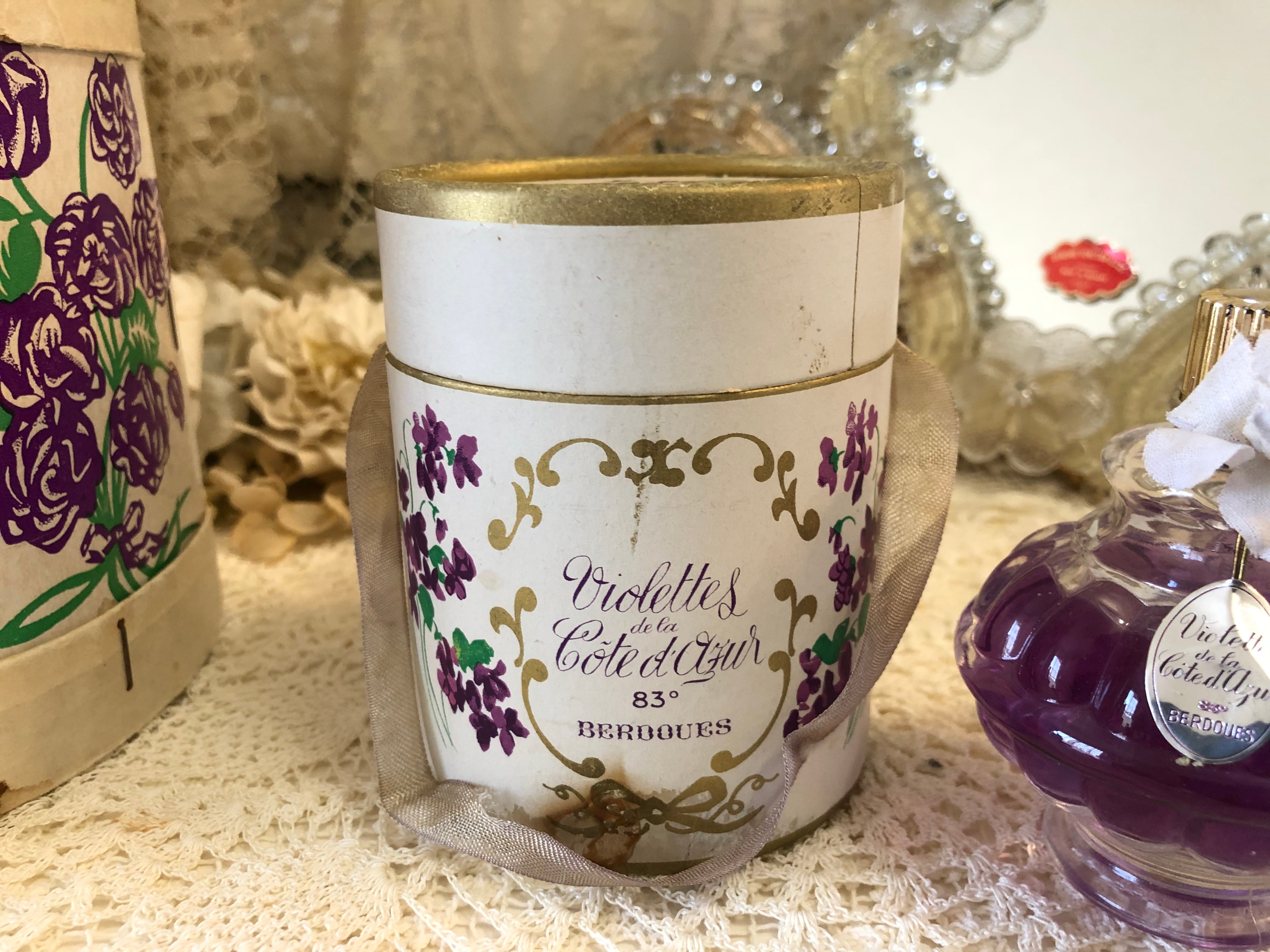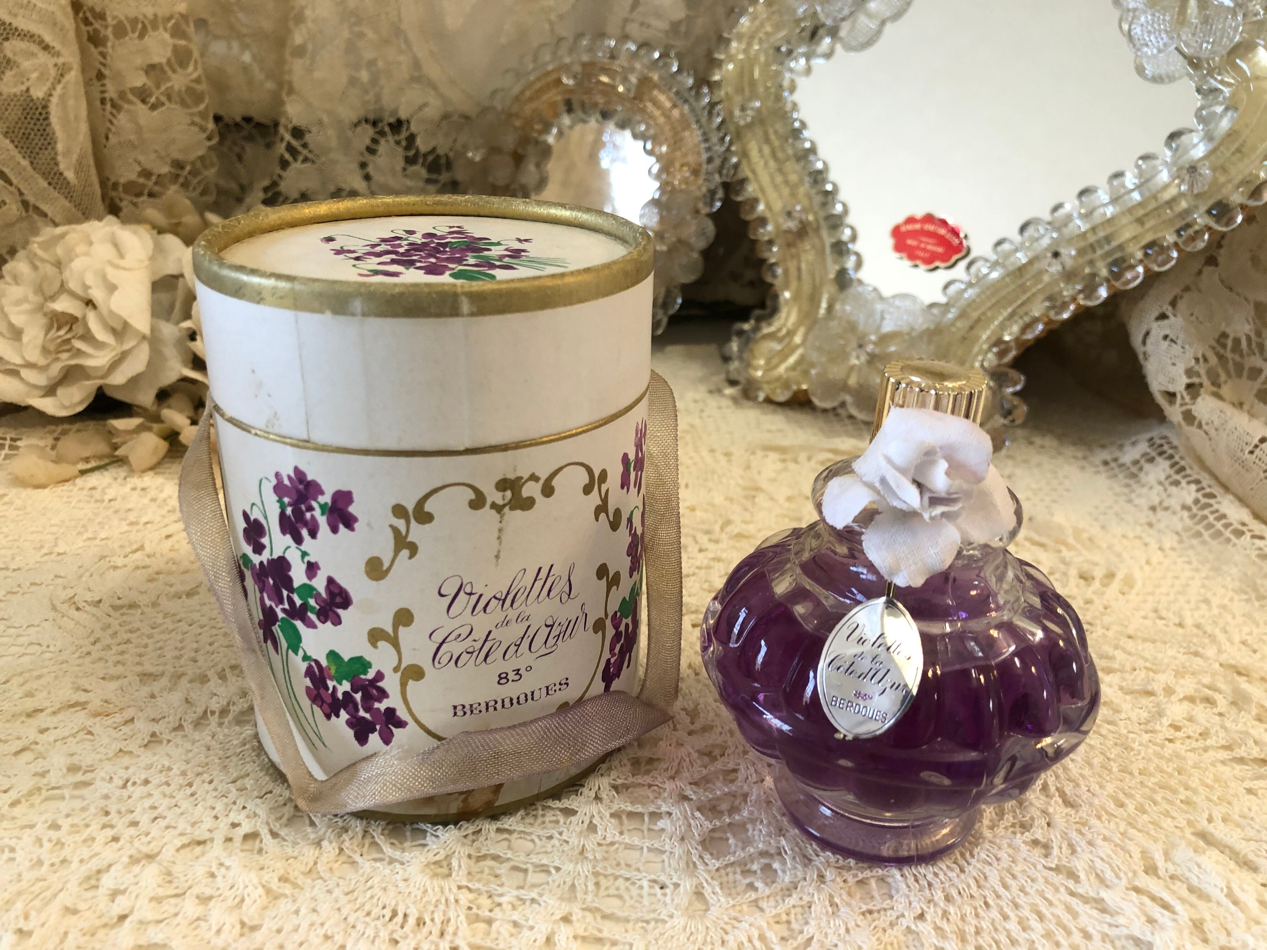 コレクターさんに人気のベルドゥ社のViolettes de Toulouseスミレの香水瓶と箱セットです。香水瓶と箱のみになります。箱手前にシミがあります。コサージュが薄い紫色ですが、調べたところ色あせではなく元からのお色のようです。他には目立つ痛みはありません。中の香水はたくさん入っています。