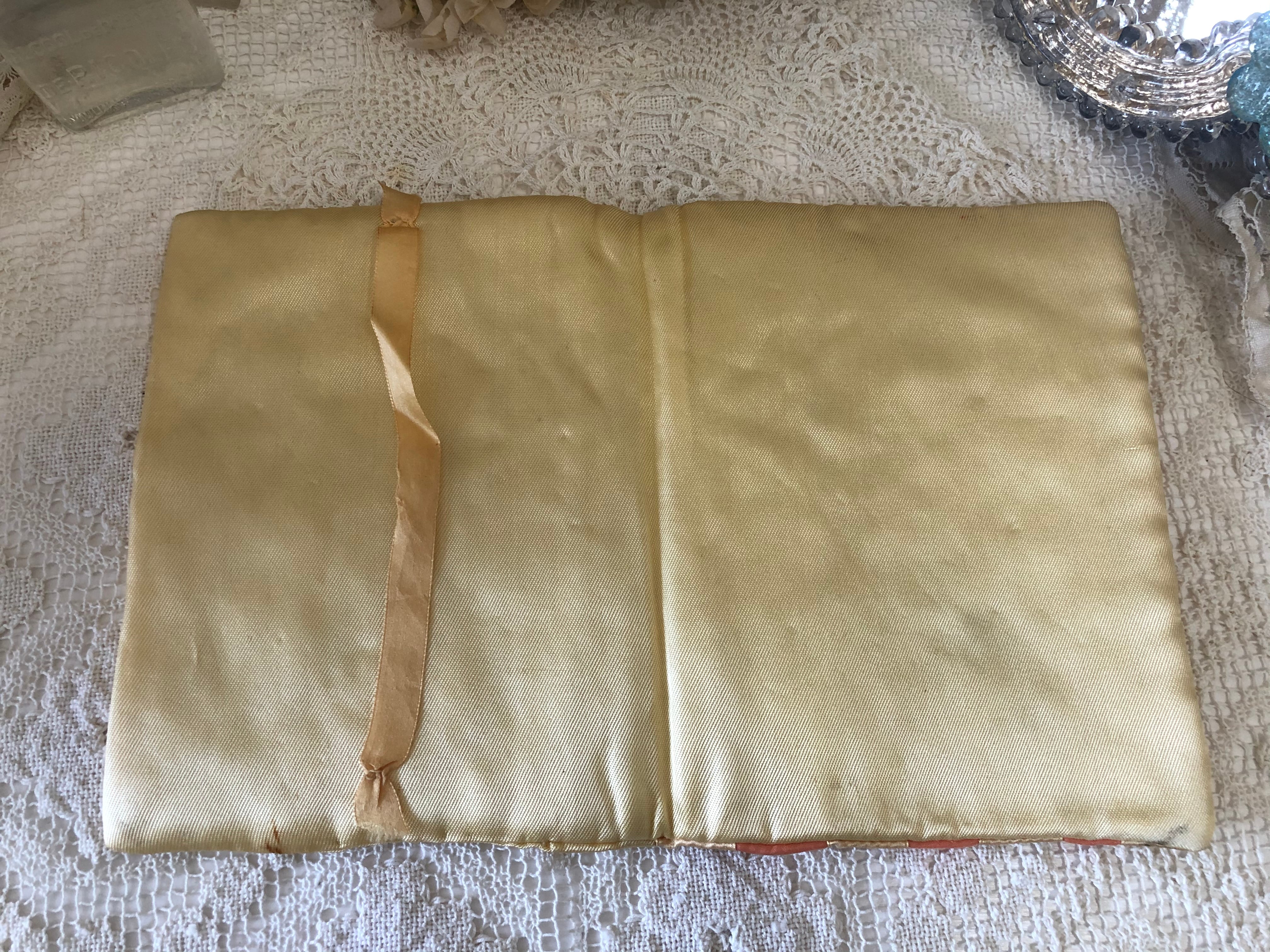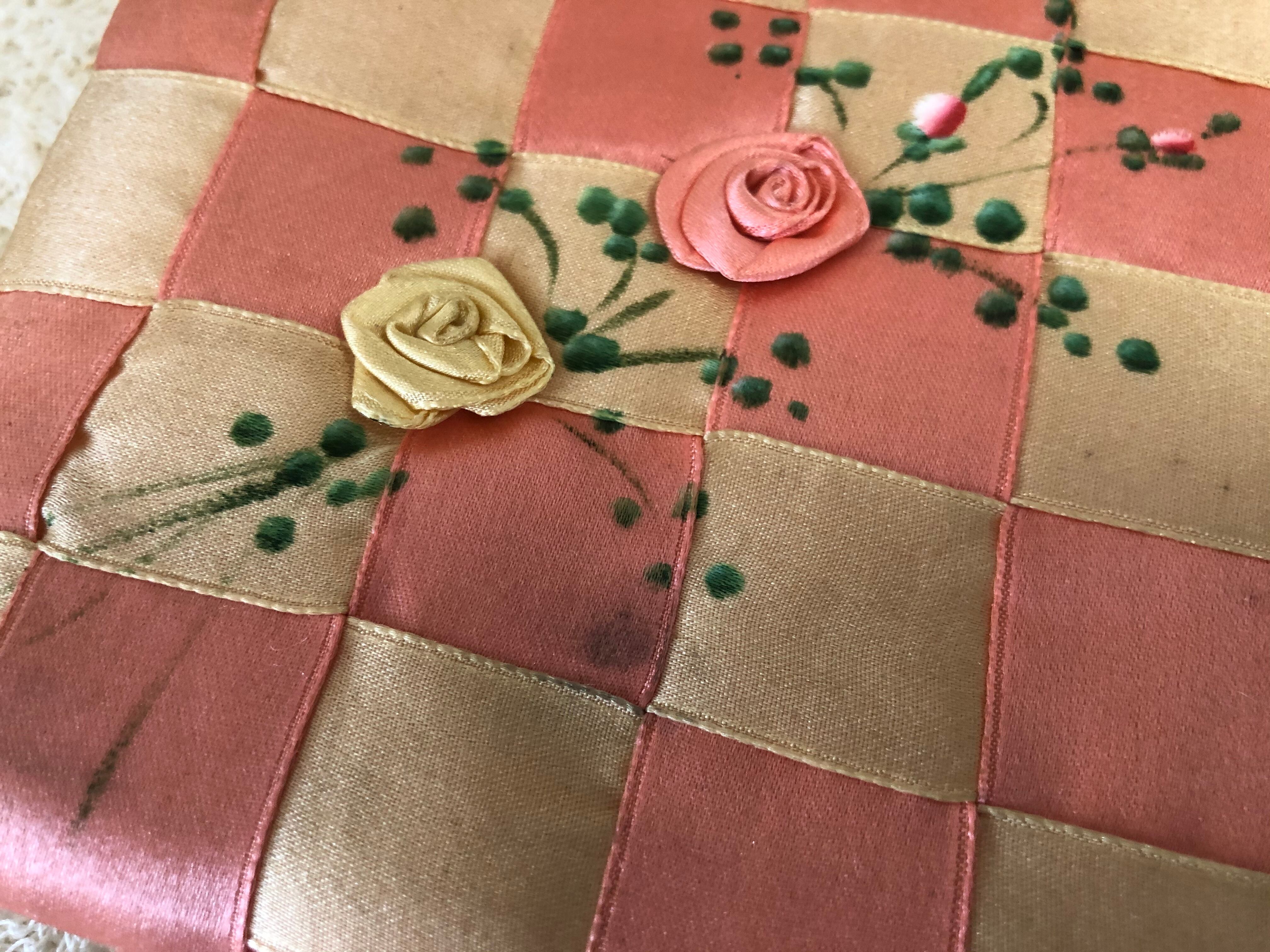 フランスのシルクのハンキー/ランジェリー・ケースです。リボンを格子状に編み込んで薔薇の刺繍を施しています。とても丁寧に作られています。色は少し濃いめの明るいピンクに、イエローに近いベージュがベースのお色です。表に一部シミがありますが、破れなく比較的良い状態です。