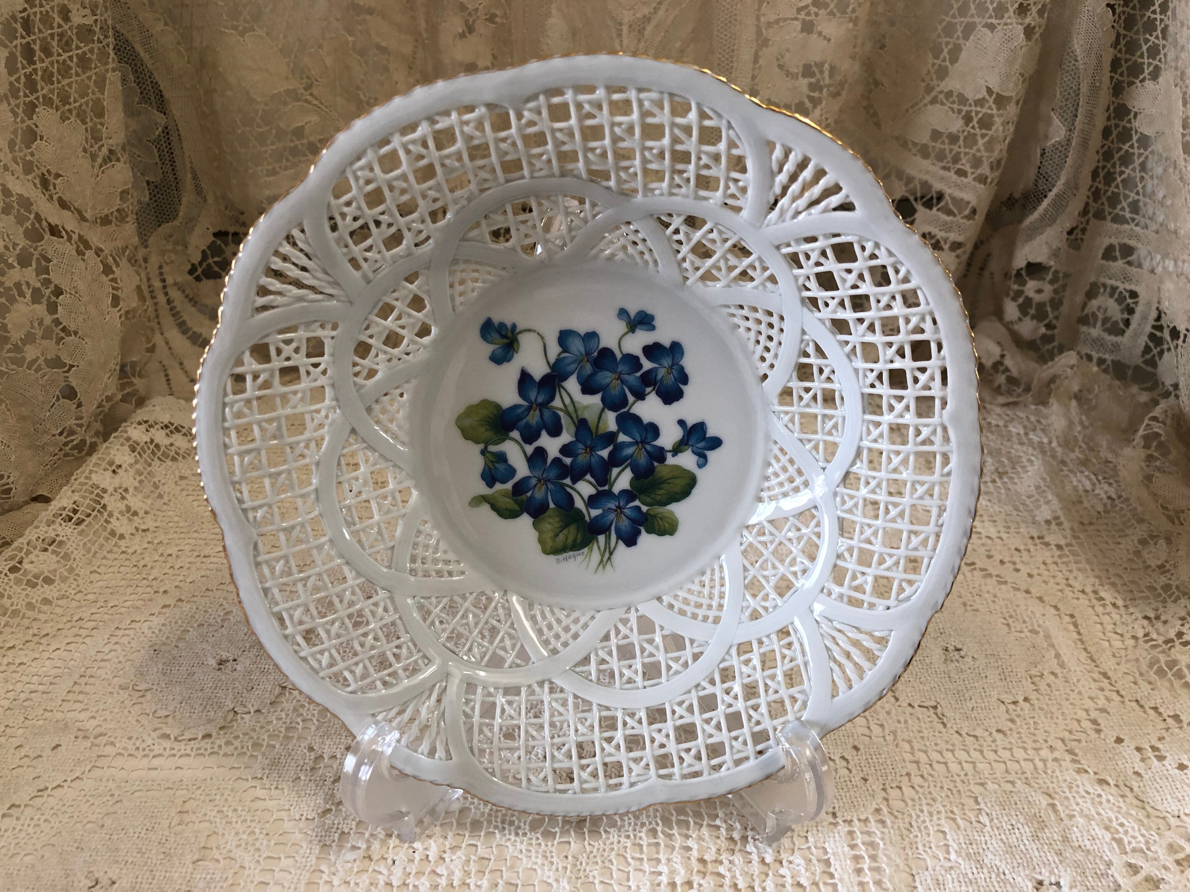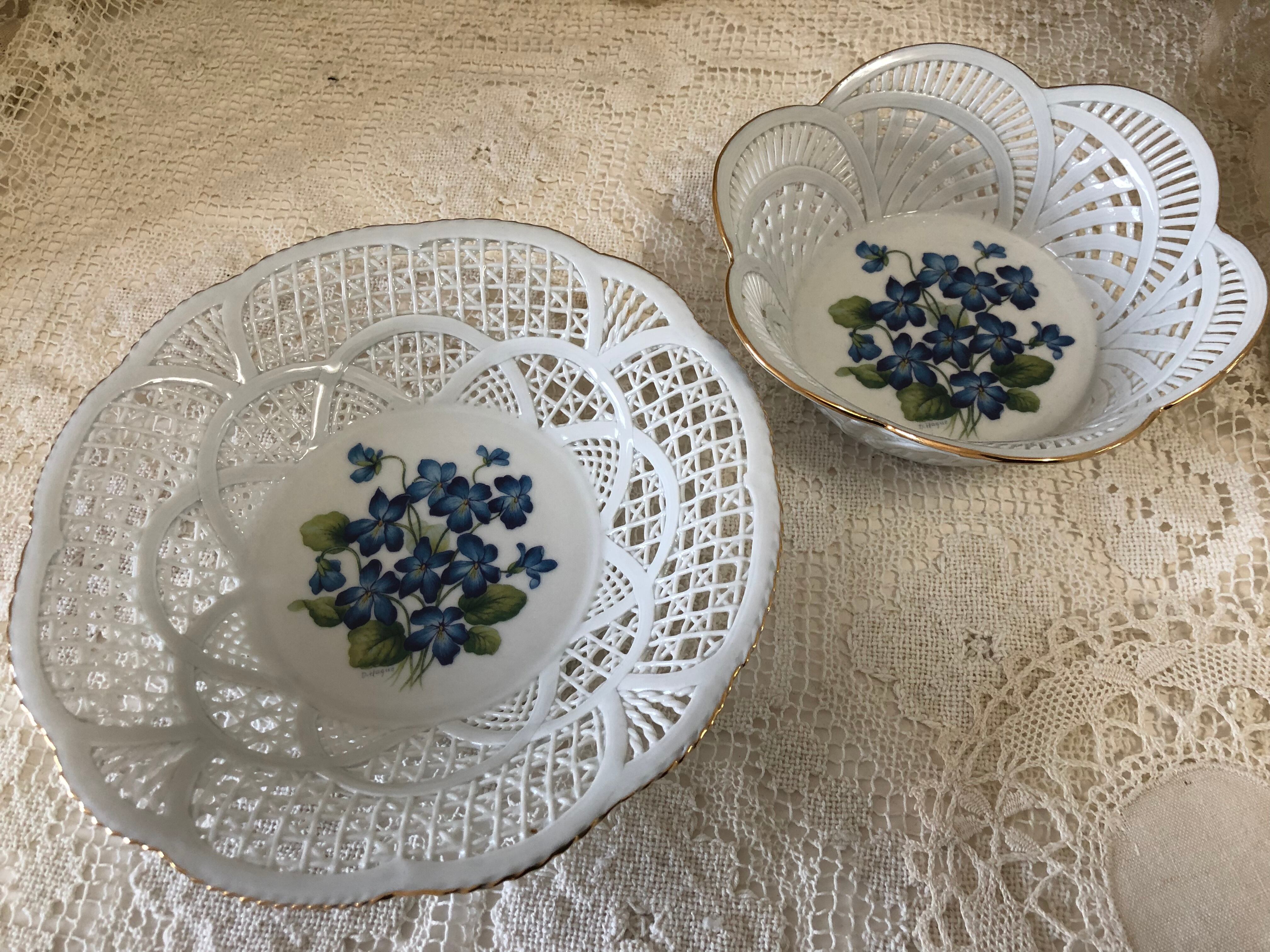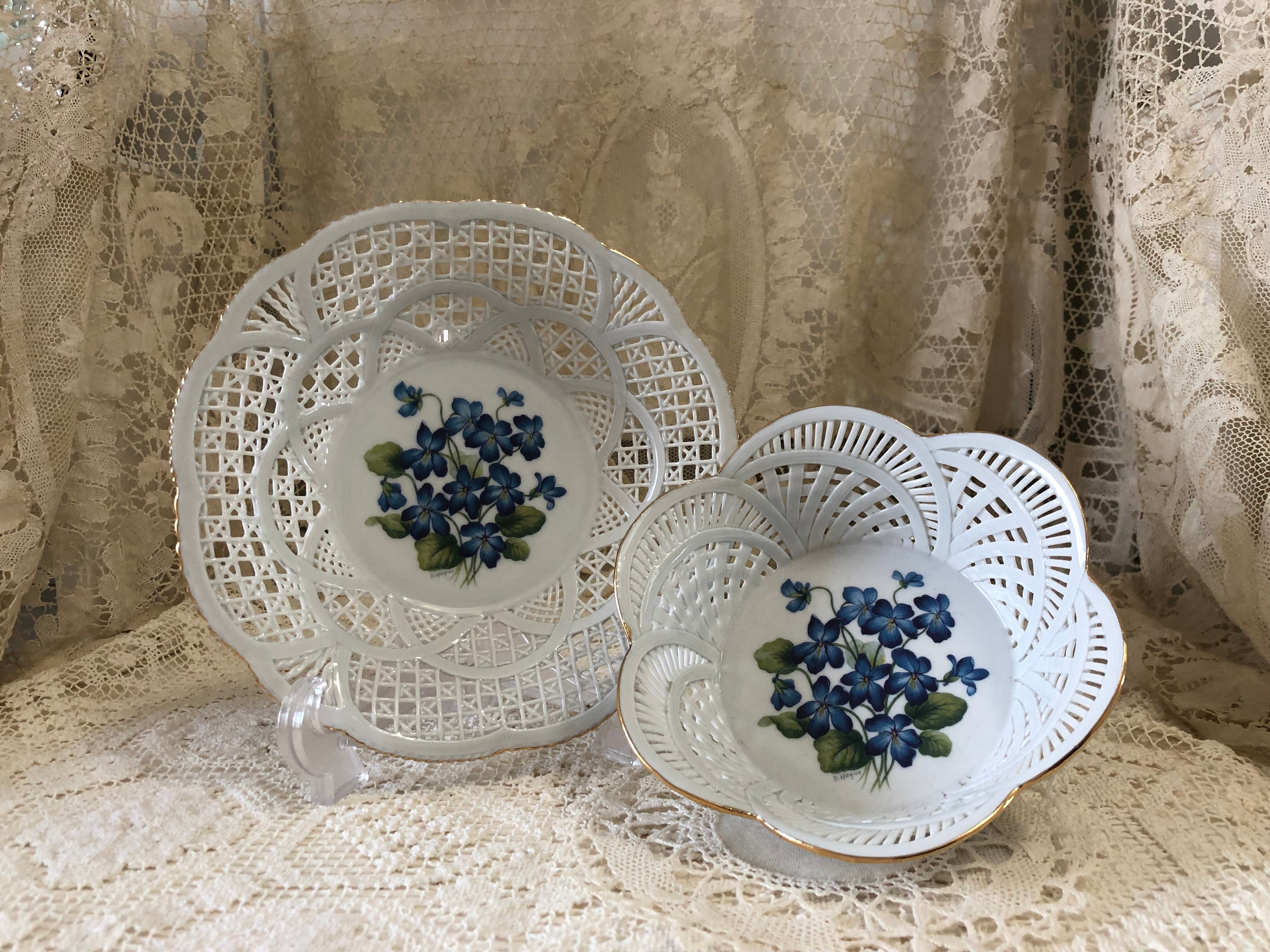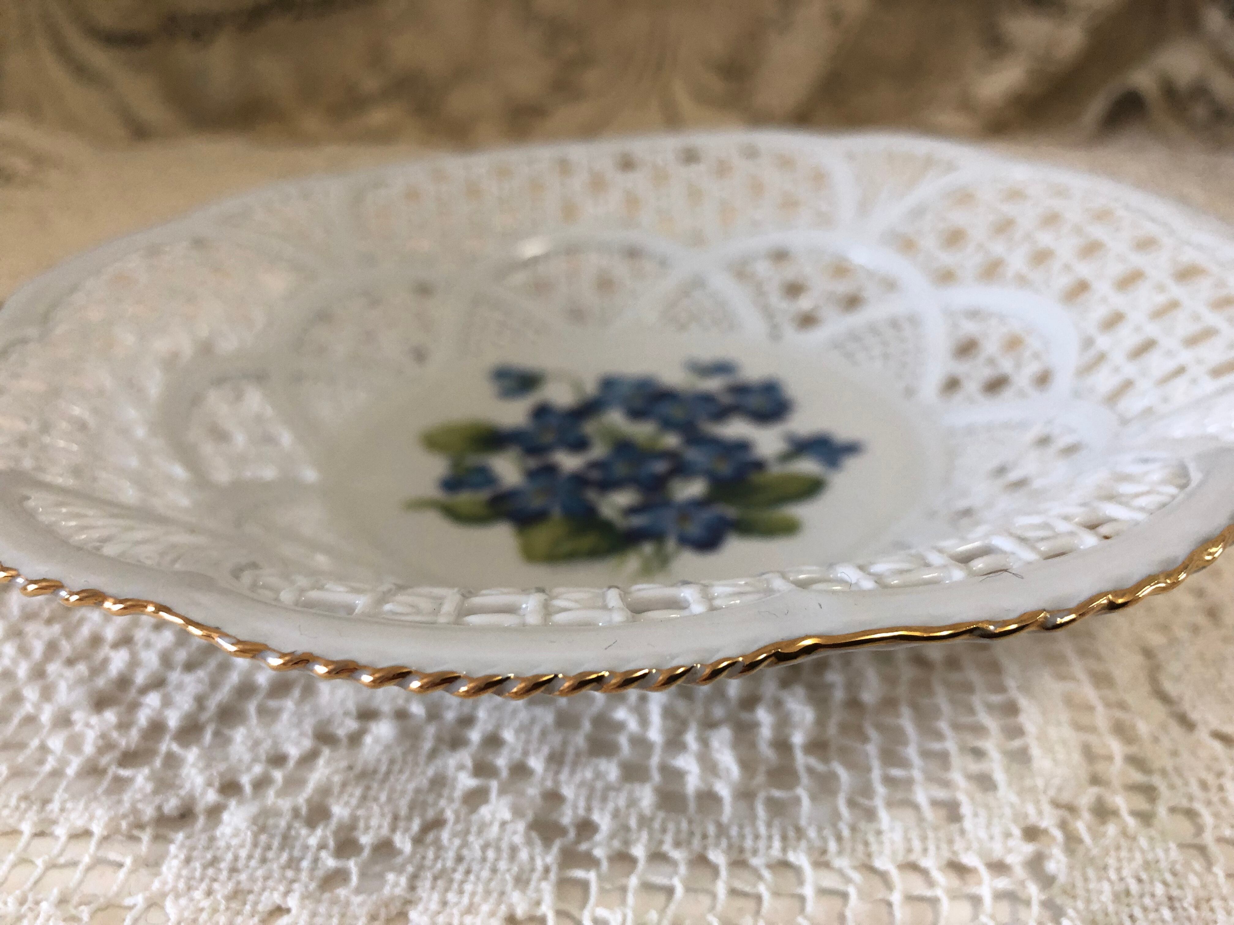 フランスのインテリアショップで販売されていたお菓子やフルーツなど入れる陶器製のバスケット・パニエです。状態はとても良く、縁の金彩の剥がれなどほとんどないため、未使用かと思われます。青いすみれ柄も珍しく、可愛らしいです。こちらは少し深さがあるプレートタイプになります。小さいサイズもございます。