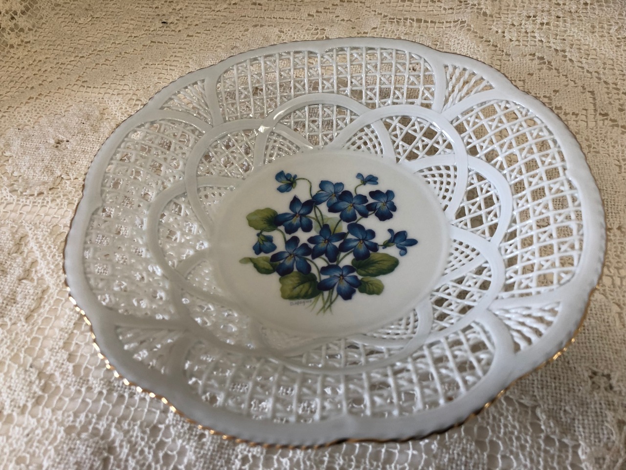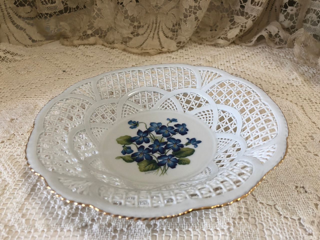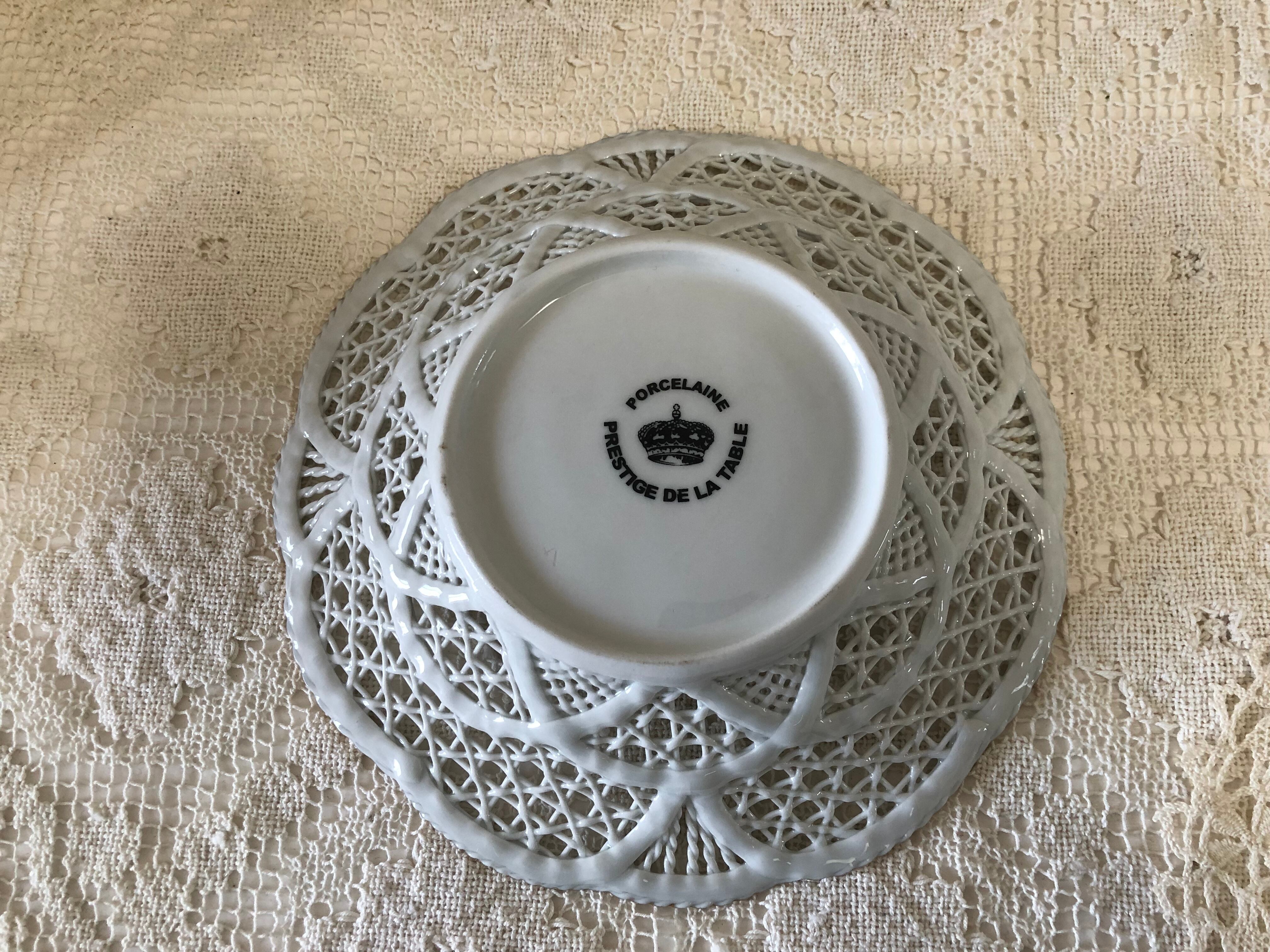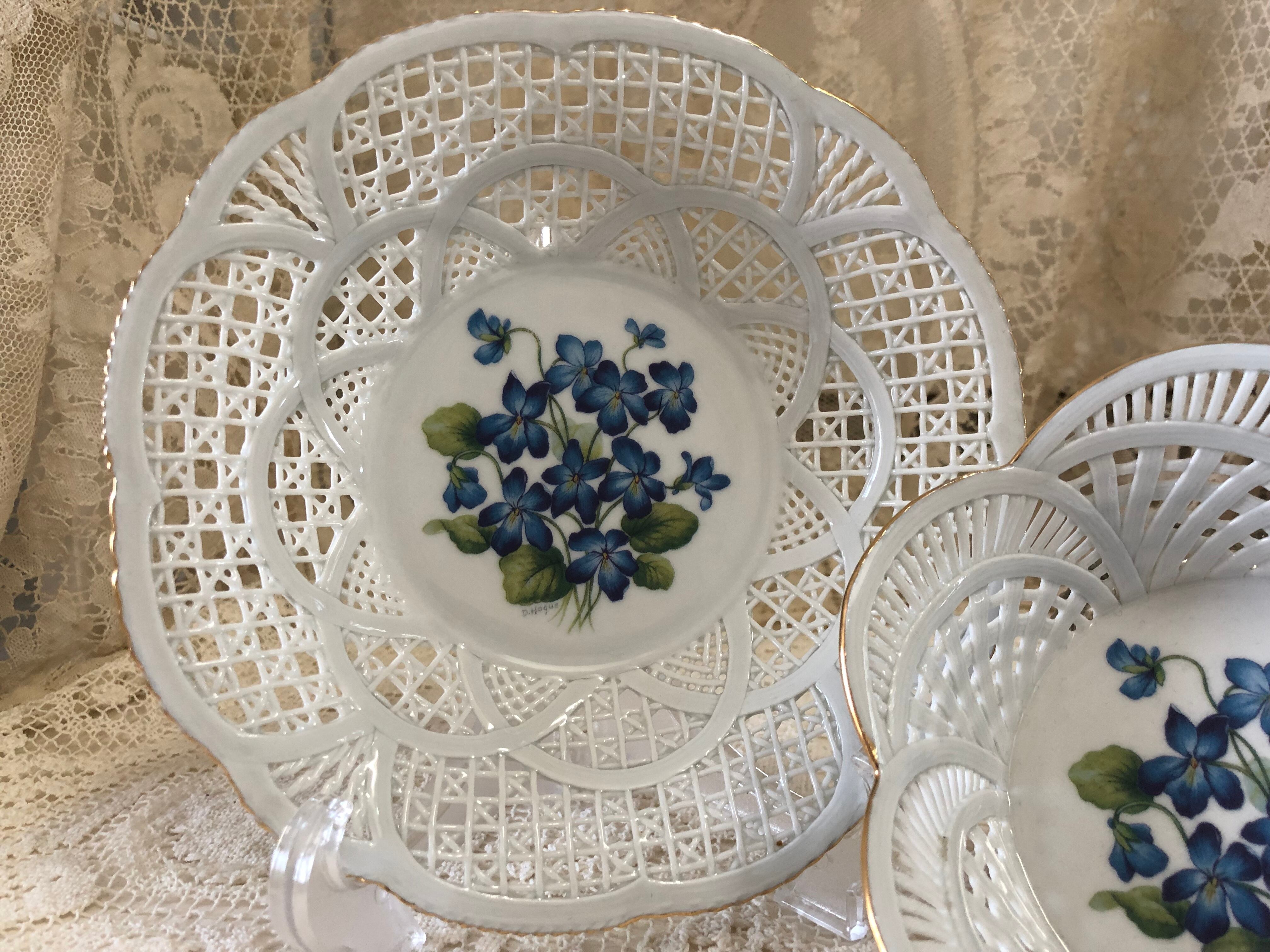フランスのインテリアショップで販売されていたお菓子やフルーツなど入れる陶器製のバスケット・パニエです。状態はとても良く、縁の金彩の剥がれなどほとんどないため、未使用かと思われます。青いすみれ柄も珍しく、可愛らしいです。こちらは少し深さがあるプレートタイプになります。小さいサイズもございます。